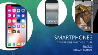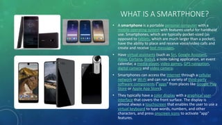 The document discusses smartphones, defining them as portable personal computers with mobile operating systems and various features such as calling, text messaging, and internet access. It reviews historical milestones in smartphone development, including the IBM Simon, the first smartphone, and the iPhone's introduction in 2007, along with insights into the Android operating system and app purchasing processes. Additionally, it outlines the pros and cons of smartphones, emphasizing their multifunctionality as well as their limitations.