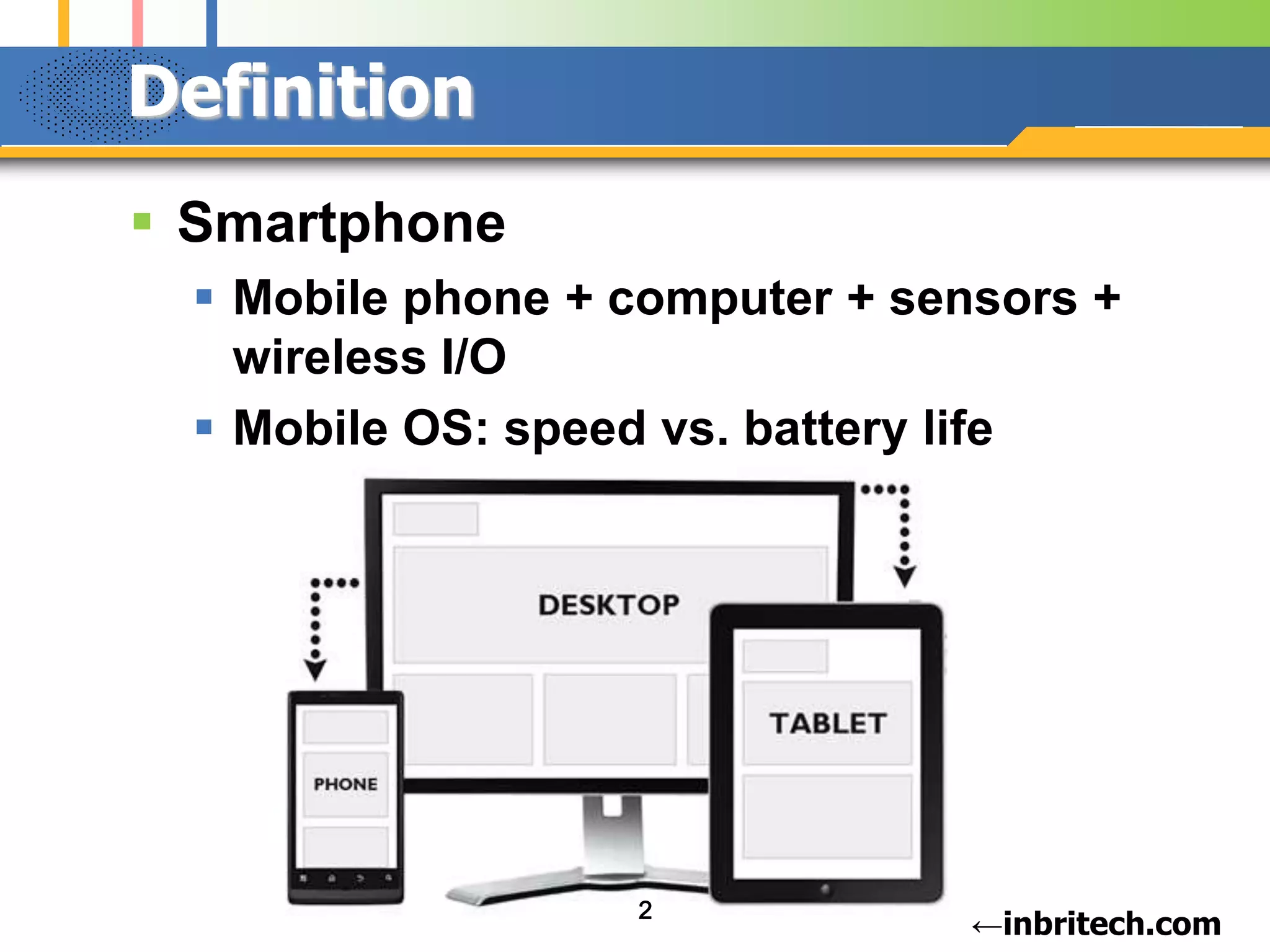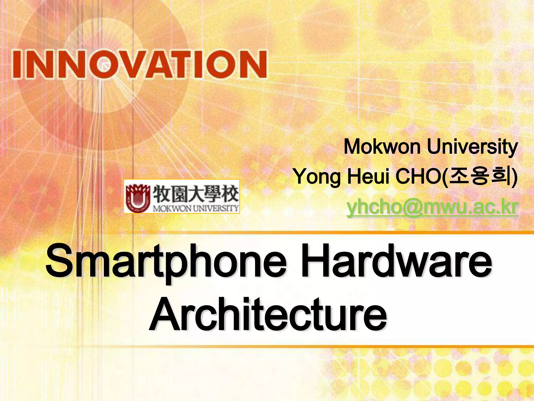 This document provides information on smartphone hardware architecture. It discusses key components such as the application and connectivity processor chips, memory, wireless capabilities, batteries, and sensors. Specific smartphones are also summarized, including the Apple iPhone 5S which uses the A7 64-bit processor and Touch ID fingerprint sensor, and the Samsung Galaxy S4 which employs the Exynos 5 Octa chip with ARM's big.LITTLE architecture. Diagrams depict the internal layout and connectivity of components in these devices.