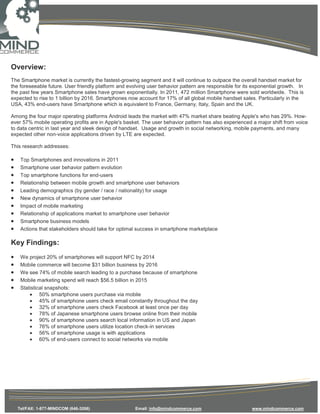 The smartphone market is the fastest-growing segment in the mobile industry, projected to reach 1 billion sales by 2016, with a significant shift in user behavior from voice to data-driven applications. Android leads the operating system market share at 47%, while Apple commands the majority of mobile operating profits. Key trends include the rise of mobile commerce, increased social networking usage, and an expected $56.5 billion in mobile marketing spend by 2015.