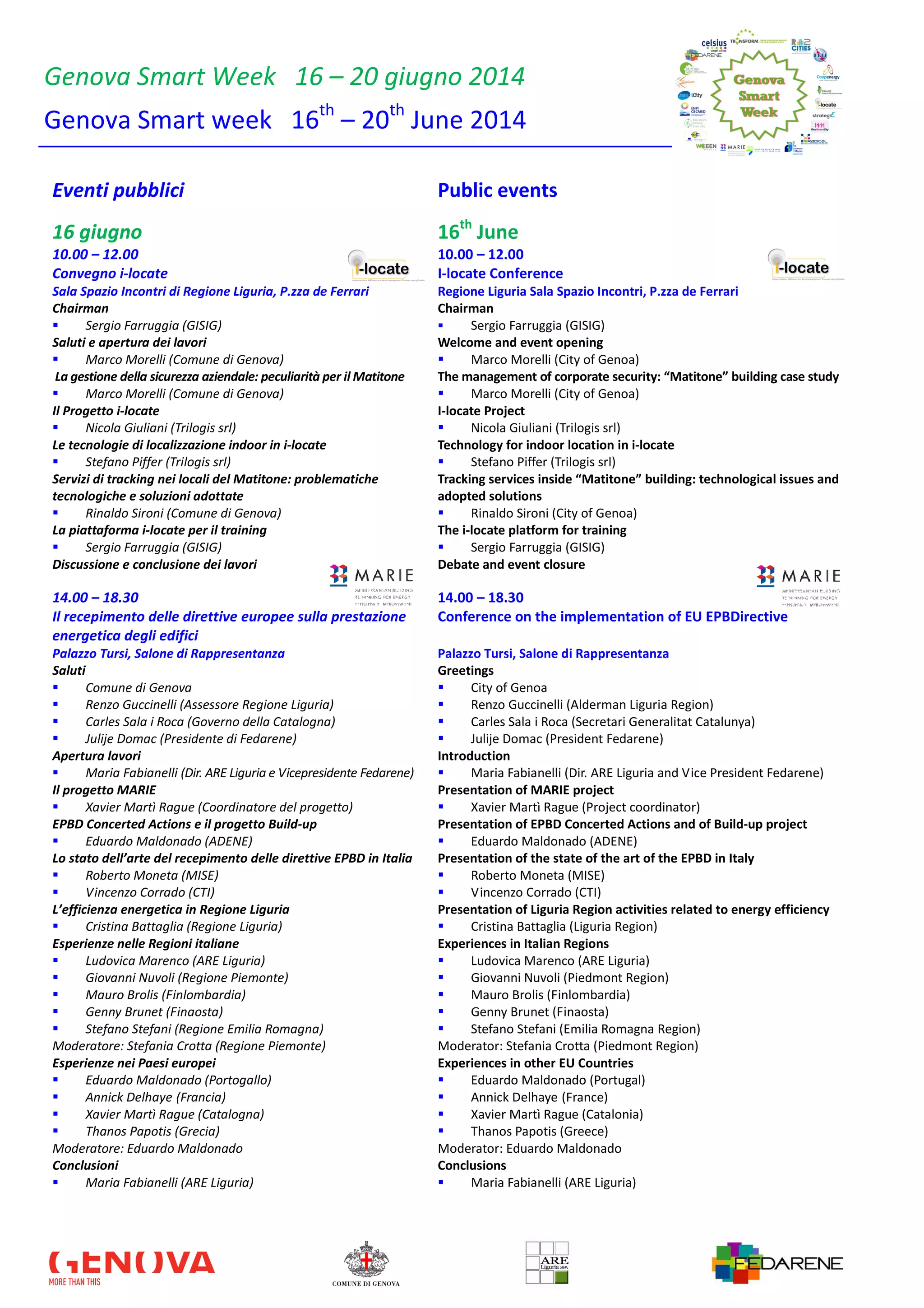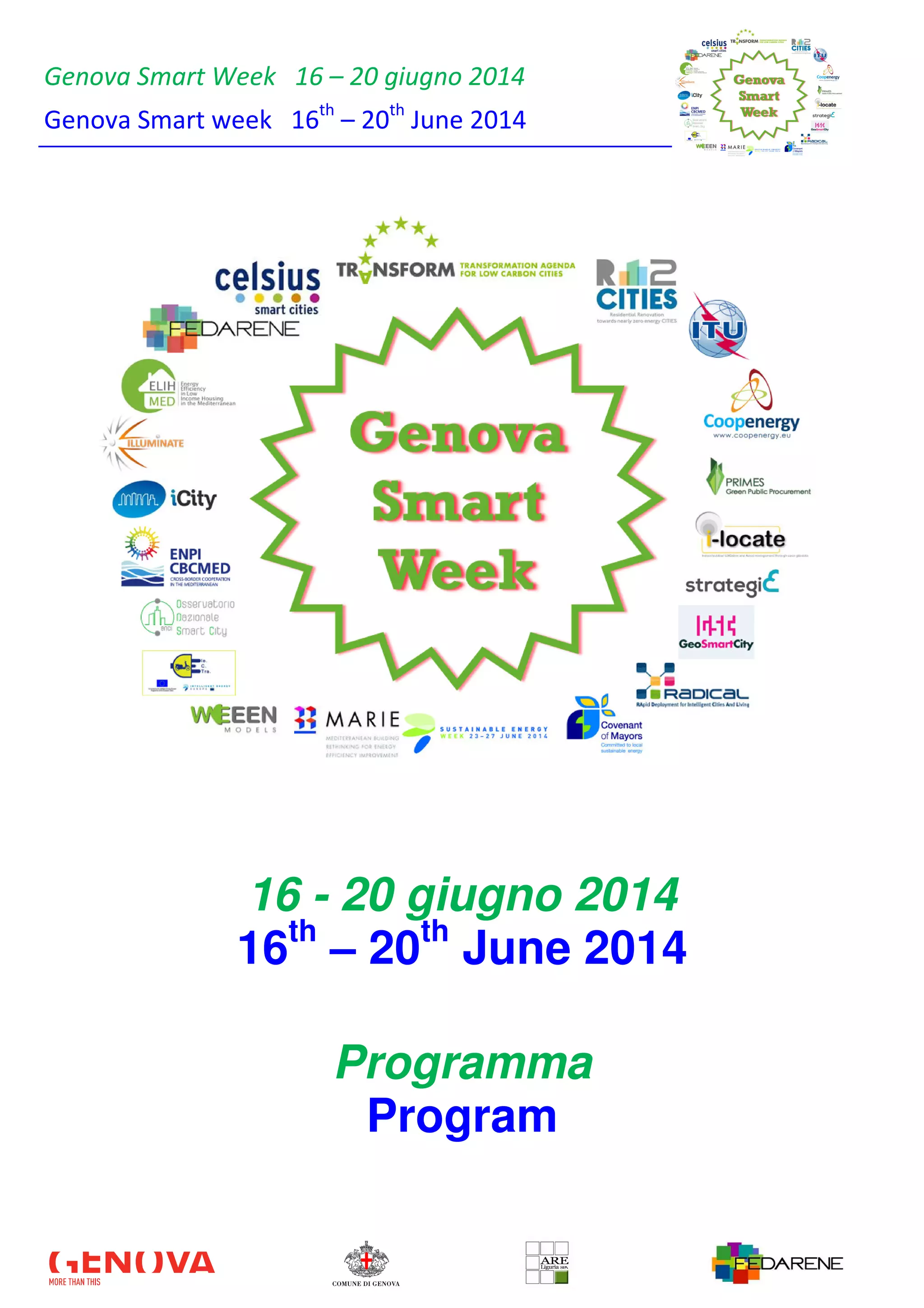 La Genova Smart Week, tenutasi dal 16 al 20 giugno 2014, ha incluso eventi pubblici e conferenze sul tema delle città intelligenti, con focus su sicurezza aziendale e prestazioni energetiche degli edifici. Sono stati presentati progetti europei e discussioni su governance e innovazione nelle smart cities. L'evento ha anche offerto opportunità di testare scooter elettrici e attività interattive con i cittadini.