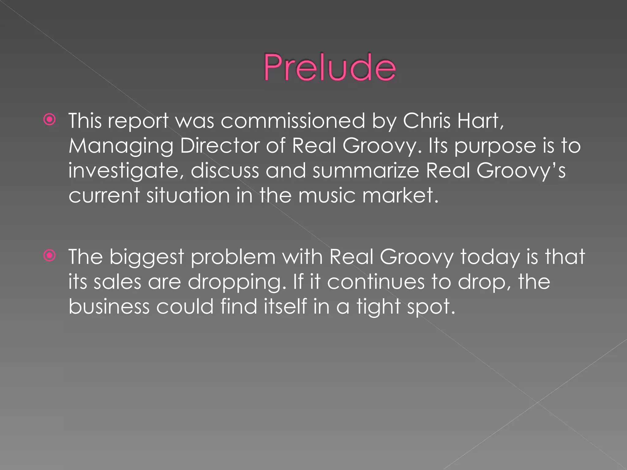 Real Groovy is facing declining music sales that threaten the viability of the business. Four key factors are identified as contributing to the falling sales: legal and illegal music downloading, competition from other companies, and a lack of opportunities for Real Groovy to expand its business. The report analyzes each of these factors and their impact on Real Groovy's sales to help its managing director understand the challenges facing the company and determine the best strategy going forward.
