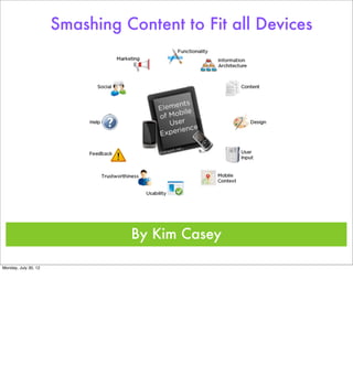 The document discusses the evolution of mobile devices from basic phones to smartphones and tablets. It notes that early mobile devices were only for communication, but now smartphones and tablets allow users to access vast amounts of information. However, content is often not optimized for different devices. The document argues that web designers must tailor content to fit on smartphones, tablets, and other devices given their widespread use and the variety of tasks people complete on different mobile platforms.