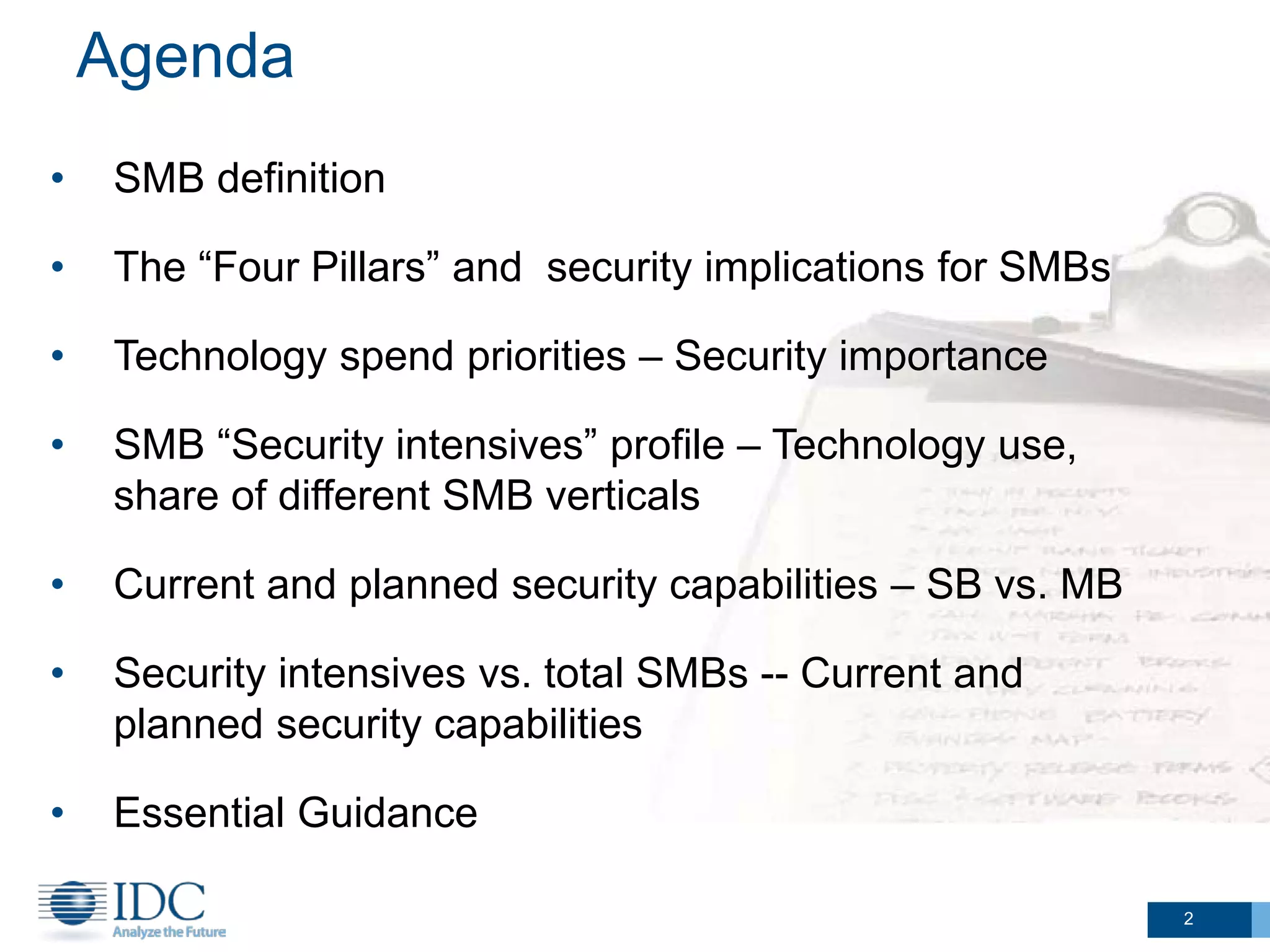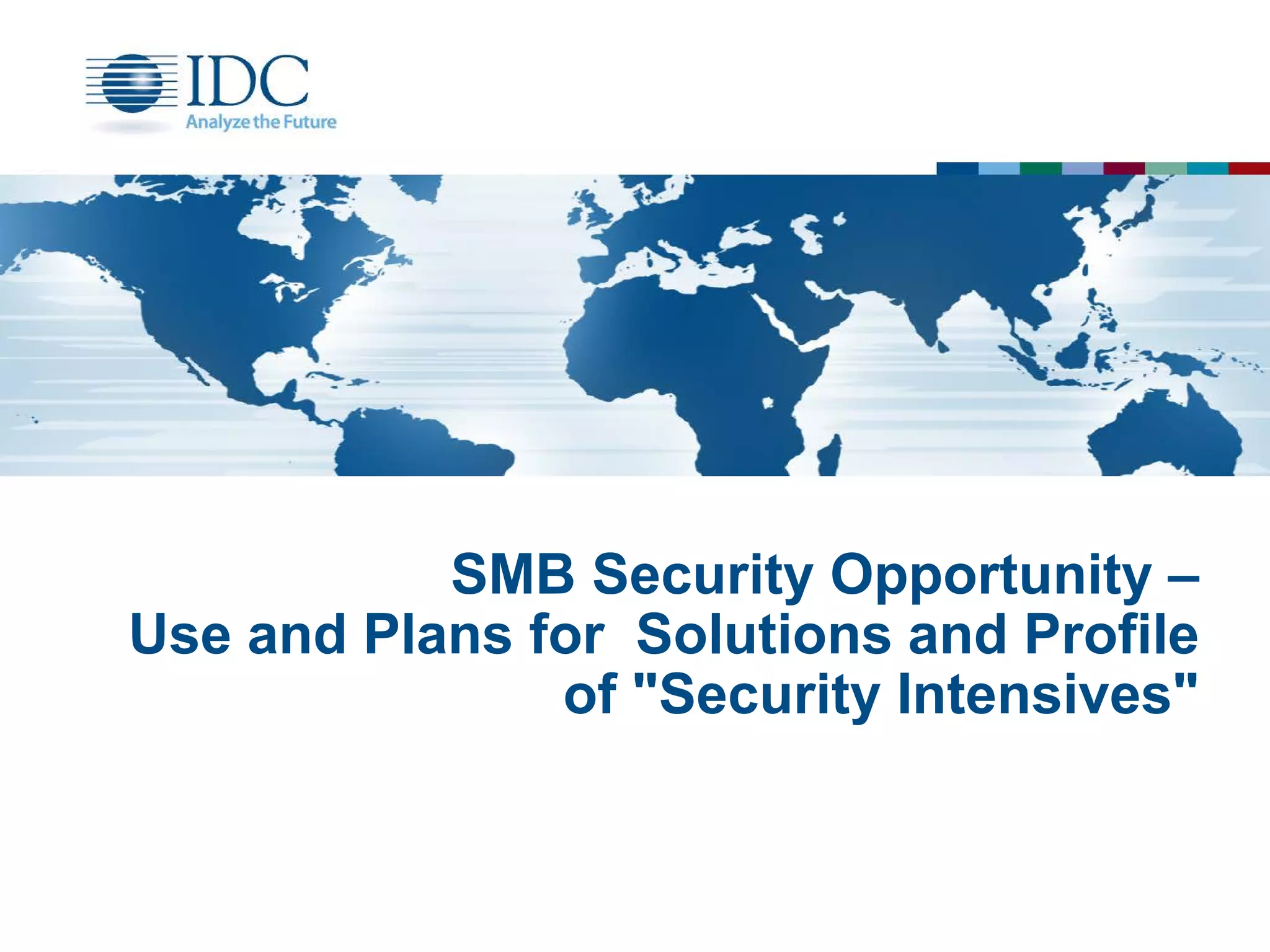 This document summarizes survey results about SMB security technology use and plans. It finds that while most SMBs prioritize basic security like antivirus, a group of "security intensive" SMBs in fields like engineering and healthcare devote more resources to security. These intensives are more likely to have IT staff, networks, and cloud services. They currently use and plan to adopt more advanced security technologies at higher rates than average SMBs, especially mid-sized businesses. The document concludes SMBs recognize the importance of security but need guidance on effective solutions as risks grow with mobility and online activities.