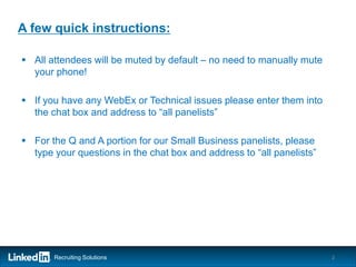 This document provides an overview of how small businesses can leverage LinkedIn for hiring. It discusses how LinkedIn allows employers to reach both active and passive job candidates. Small businesses make up the majority of U.S. businesses and face challenges in finding qualified applicants. The document then outlines LinkedIn products like Career Pages, Work With Us, and LinkedIn Recruiter that small businesses are using successfully to improve key metrics like time-to-hire and cost-per-hire. It concludes with five tips for small businesses to get started leveraging LinkedIn for recruiting.
