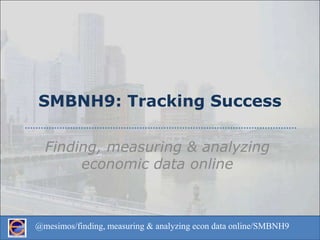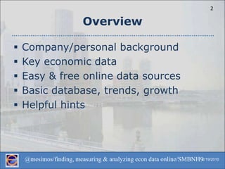 This document provides tips and resources for finding, organizing, and analyzing key economic data online for business purposes. It outlines important economic metrics like GDP, employment, and production. It then describes easy-to-use, free sources for this data from organizations like the Bureau of Labor Statistics, BEA, Federal Reserve, and Census. The document offers advice on setting up a simple spreadsheet to track and organize the data over time, accounting for factors like seasonality. It also provides examples of basic analytical techniques like measuring month-over-month, year-over-year, and average growth rates to identify trends in the data.