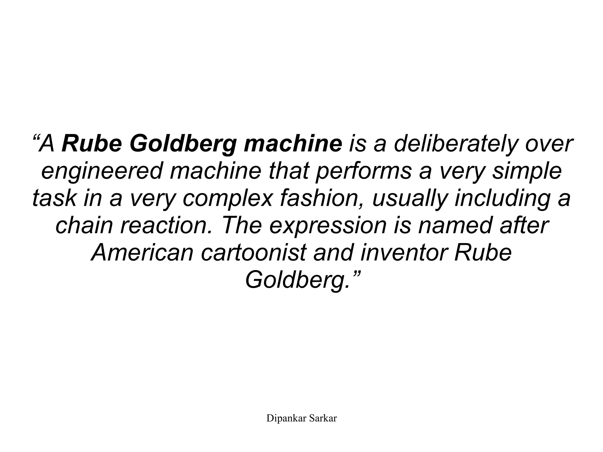 The document discusses the concept of a Rube Goldberg machine, which performs simple tasks in complex ways, while also exploring themes of creativity, business, and the unique challenges faced by Indian startups in the internet market. It incorporates references to personal growth and artistic expressions of work, including a quote from Andy Warhol. The author invites questions and shares personal contact information.