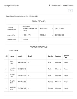 The document provides details about the School Management Committee (SMC) of VIDYALAYA PRABANDHAN SAMITI, GINJAL including bank account details, names of 16 committee members with their roles, and date of last reconstitution being 25-Nov-2021. The committee includes members from parents, teachers, and local government.