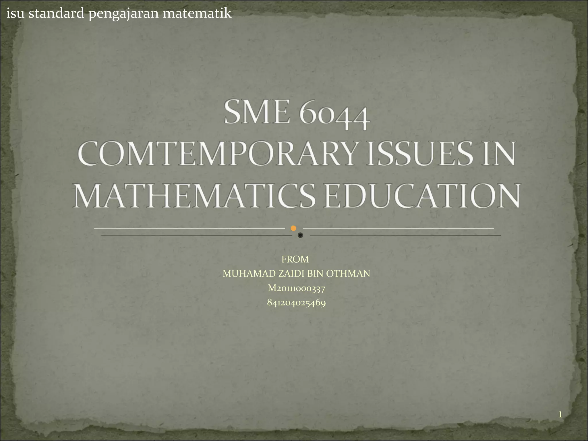Dokumen tersebut membahas mengenai isu-isu standar pengajaran matematik di Malaysia. Secara ringkas, dokumen tersebut menjelaskan empat pendekatan utama dalam pengajaran matematik yaitu pendekatan kemahiran, pendekatan konseptual, pendekatan penyelesaian masalah, dan pendekatan penyiasatan. Dokumen tersebut juga membahas mengenai Standard Guru Malaysia yang menetapkan kompetensi yang harus dimiliki oleh guru.