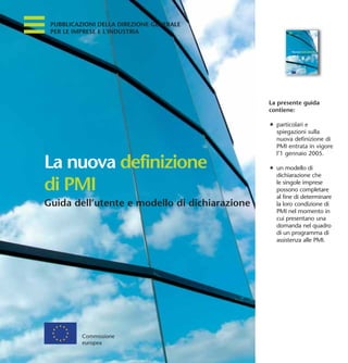 La guida della Commissione Europea presenta la nuova definizione di PMI, entrata in vigore il 1 gennaio 2005, che delinea i criteri per classificare le imprese come micro, piccole o medie. Sottolinea l'importanza delle PMI nell'economia europea e il loro accesso ai finanziamenti, mirato a promuovere l'innovazione e la crescita. La guida fornisce anche un modello di dichiarazione per l'autovalutazione delle imprese e chiarisce le differenze tra aziende autonome, associate e collegate.