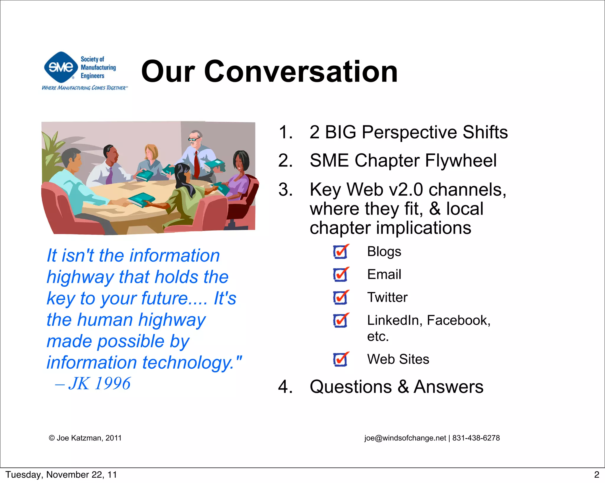 The document discusses how organizations can use social media to engage with audiences. It outlines key social media channels like blogs, email, Twitter and their benefits. It also presents a "flywheel" model for how organizations can attract, engage, retain and learn from members to strengthen their online presence through these channels. The goal is to tap into the "human network" and communicate with a networked audience by following trends on social media.