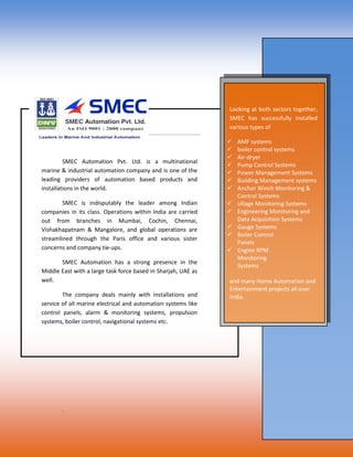 SMEC Automation Pvt. Ltd is an Indian automation company that provides training through its research and development division called SMEClabs. SMEClabs trains both experienced professionals and fresh graduates in industrial and marine automation systems like PLCs, SCADA, HMIs, VFDs, and more. The training is practical and hands-on focused to provide students with real-world job skills. SMEClabs also assists students with job placement in industrial and marine fields through its parent company.