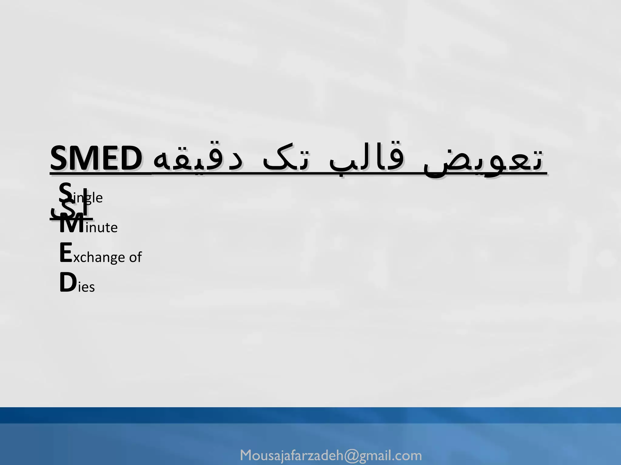 مراحل به كارگیرىعملى SMED در یک كارخانه از كليه فعاليت هاى تعويض قالب فيلم بردارى كنيد . تيمى متشكل از پرسنل توليدى و مسئولان فنى تعويض قالب ها تشكيل دهيد . تيم را مسئول ديدن فيلم گرفته شده و آناليز آن كنيد . تيم هاى مسئول تعويض قالب بايد حداقل از دو نفر تشكيل شود . همواره اصرار به ارائه زمان هاى كوتاه تر توسط تيم داشته باشيد . تمامى تلاش تيم را بر روى كاهش زمان فرآيندهاى گلوگاهى متمركز كنيد . همواره به اين نكته توجه كنيد كه (SMED) يك فرايند پیوسته و دائمى است و نه يک فرايند موقت و مقطعى . [email_address]