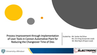 The document outlines a process improvement initiative at a Cannon automotive plant aimed at reducing die changeover time using lean tools. It highlights the current challenges, including efficiency issues and excessive time wasted during changeovers, and proposes solutions using the Single Minute Exchange of Die (SMED) methodology to streamline operations. The implementation of new procedures is expected to significantly reduce changeover time, enhance overall equipment effectiveness (OEE), and meet customer demands efficiently.