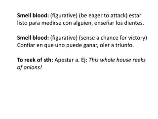 The document discusses various idioms and expressions related to smell in English. It provides definitions and examples for idioms such as "smell the roses" which means to appreciate the good things, "a rose by any other name would smell as sweet" which means something is more important than its name suggests, and "smell blood" which means to sense an opportunity for victory or attack. It also discusses idioms involving smelling something fishy, smelly, or rotten.