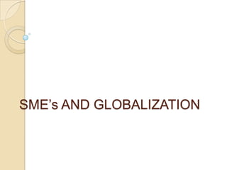 Small and medium enterprises (SMEs) play an important role in innovation, job creation, and competition. However, SMEs face various constraints such as financial, technological, and skills barriers. Globalization can provide both advantages and disadvantages for SMEs. The advantages include greater employment opportunities and access to wider markets. However, larger countries may take advantage of lower wages and natural resources in other nations. Globalization can also negatively impact local industries and spread unhealthy trends.
