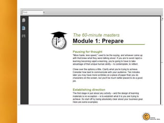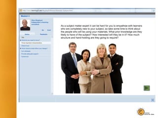 The document discusses best practices for training subject matter experts (SMEs) to develop rapid e-learning materials, including having SMEs provide content while training experts handle instructional design, using structured software templates to standardize development, and providing resources for SMEs to learn e-learning design skills.