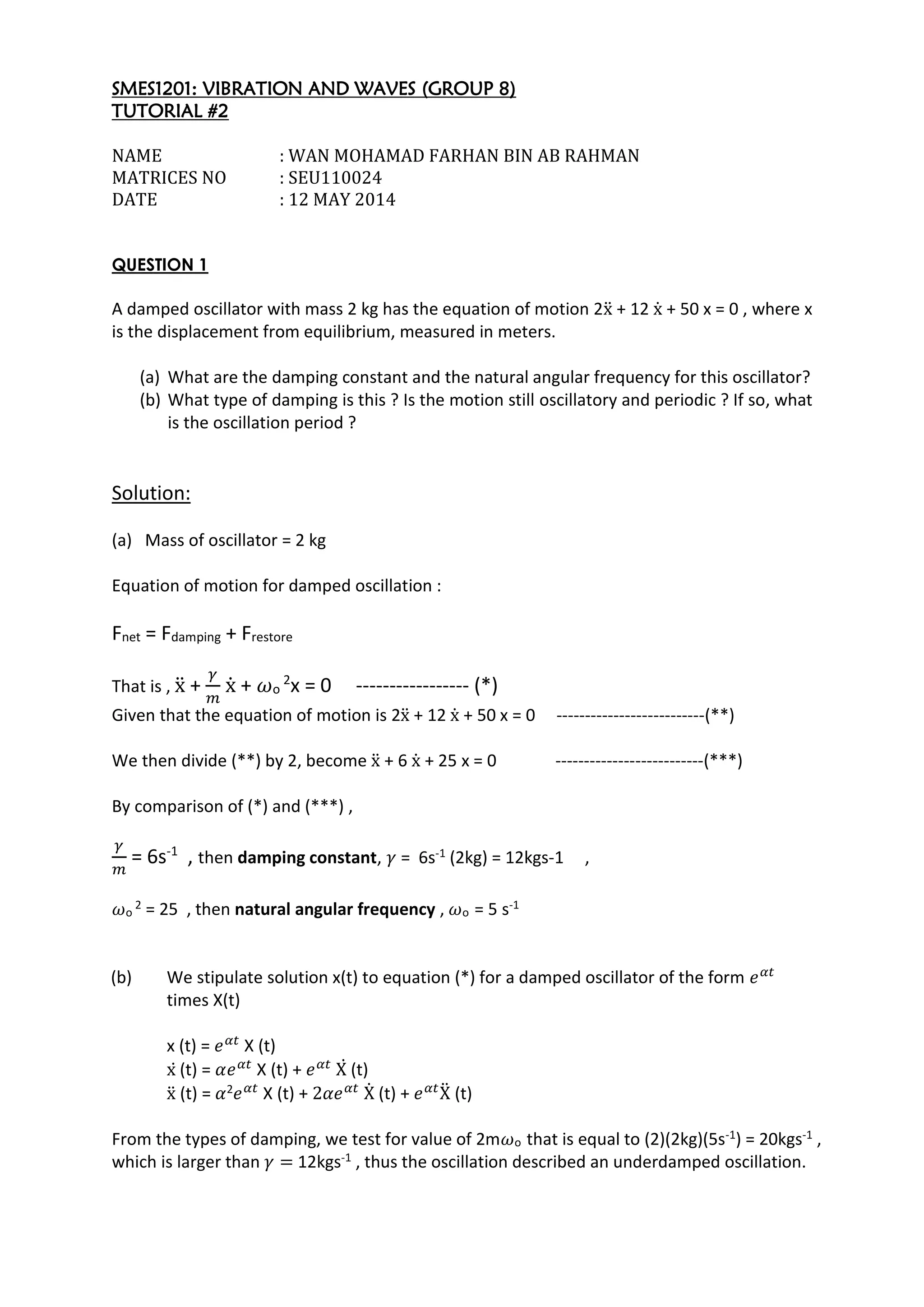 Question 1 involves finding the damping constant, natural frequency, and oscillation period for a damped oscillator. Question 2 determines the period and natural frequency of a damped block-spring system.