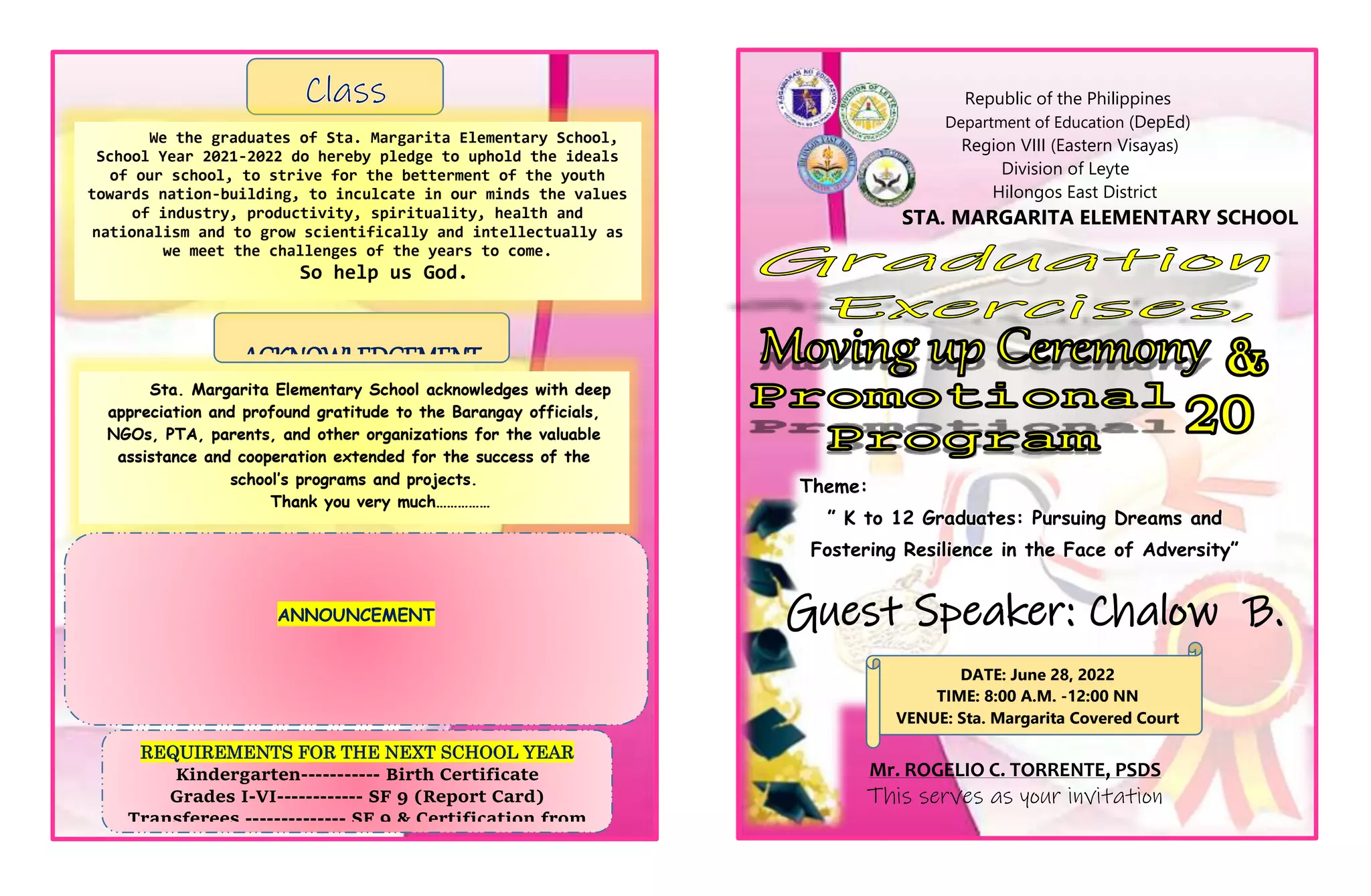 This document contains an invitation and program details for a graduation ceremony at Sta. Margarita Elementary School. It acknowledges support from barangay officials, NGOs, PTA, parents, and other organizations. It provides requirements for enrollment in the next school year. It includes the graduation theme, guest speaker, date, time, venue and lists various committees. It also contains messages from the regional director, schools division superintendent and school accomplishments. The program of activities includes a baccalaureate mass, graduation exercises, and moving up ceremony.