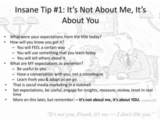The document outlines seven innovative social marketing tips used by Fortune 100 companies, emphasizing that effective social media marketing prioritizes audience engagement and experience rather than direct selling. Key strategies include understanding audience needs, fostering genuine connections, embracing agility in content creation, and measuring success through insights rather than mere engagement metrics. Additionally, it highlights the necessity of adapting marketing strategies to changing social media dynamics and cultivating a strong narrative through storytelling.