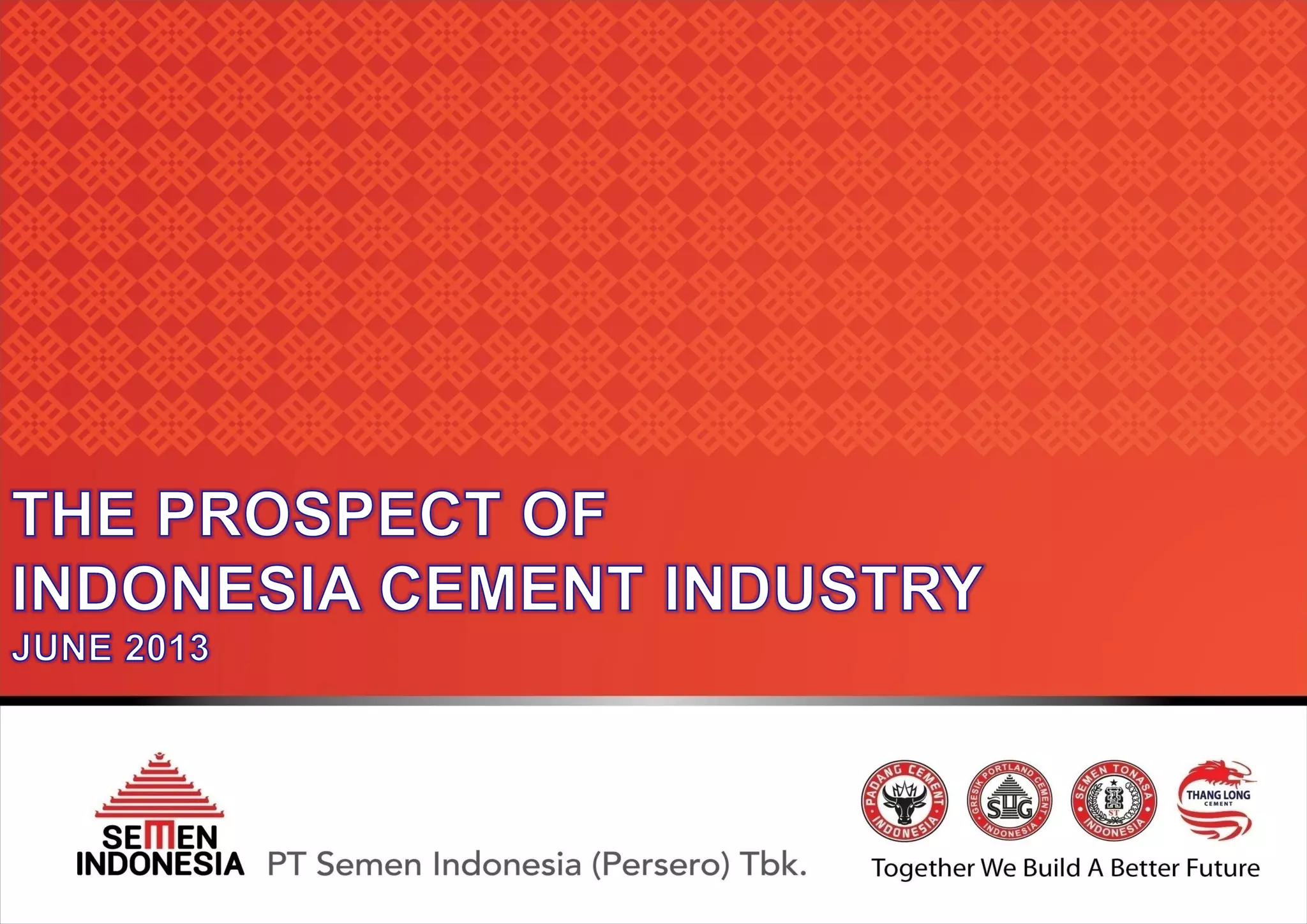 This document provides an overview of Indonesia's cement industry and Semen Indonesia's position within it. It notes that cement production capacity in Indonesia is expected to almost double to 108 million tons by 2017, driven by new plants from both domestic and foreign players. Semen Indonesia currently has the largest market share in Indonesia at 43.7% and will also be expanding capacity. The key drivers of future domestic cement demand are expected to be national economic growth, infrastructure expansion, and increasing per capita consumption as Indonesia's per capita consumption is still relatively low compared to other countries.