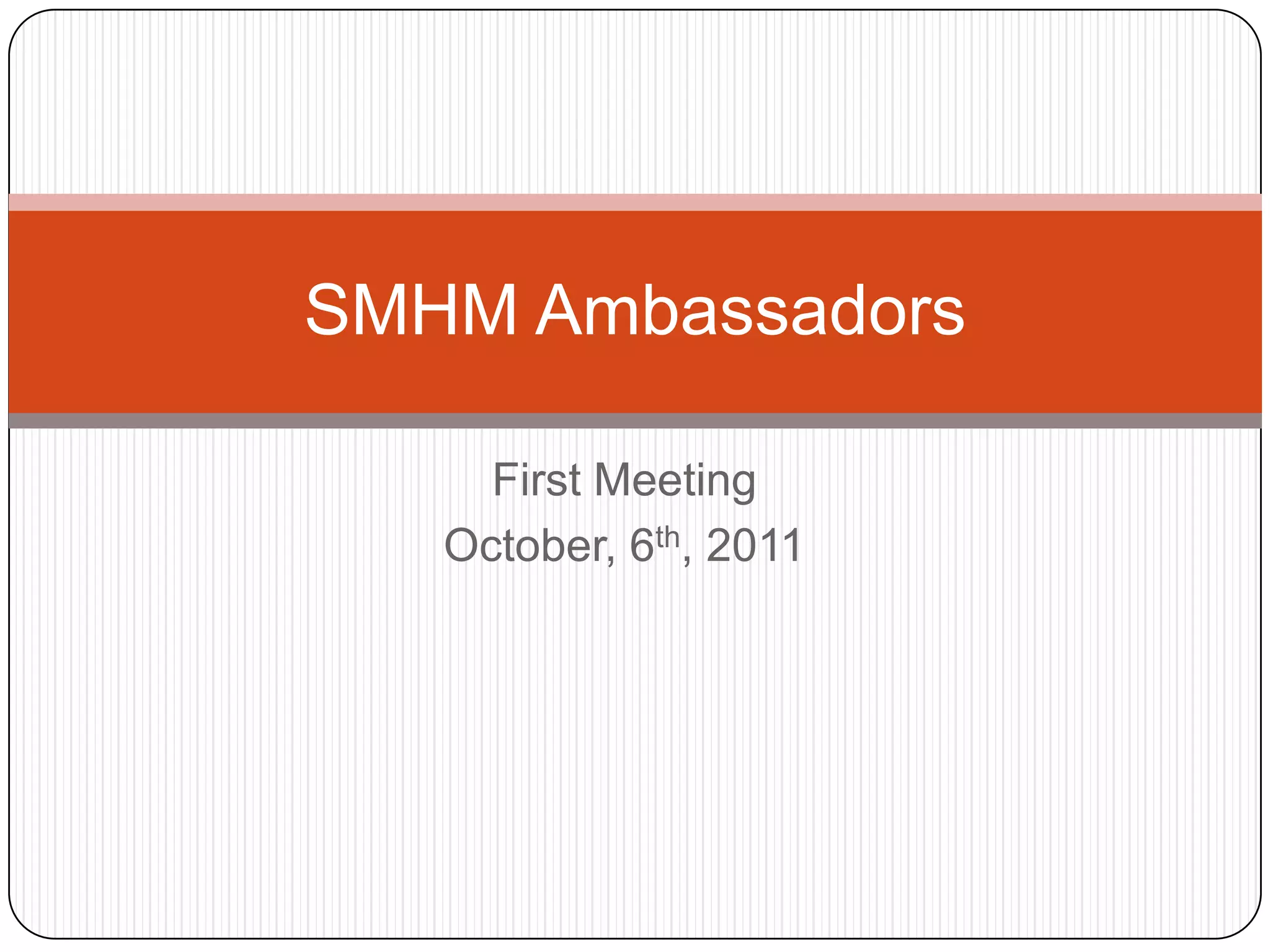This document summarizes the minutes from a SMHM Ambassadors meeting on October 6th, 2011. It lists upcoming volunteer opportunities and events for committees like Community Service, Event Planning, and Campus Tours. These include a Boo Bash on October 28th, helping with Homecoming activities from October 22nd-25th, and touring Dallas ISD students around campus on December 1st. It also announces volunteer shifts for merchandise sales on November 10th and an etiquette dinner on October 27th. Membership dues of $30 are due by October 31st to receive an ambassador t-shirt. The next meeting will be on October 20th at 6:30pm.