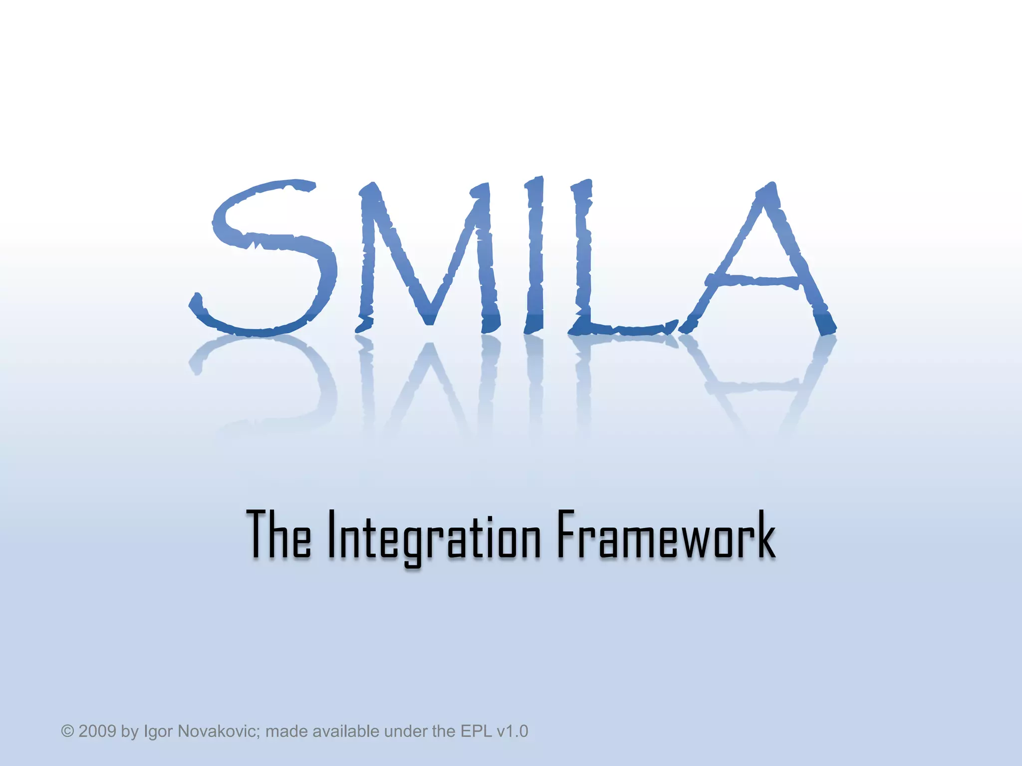 SMILA is an open source Eclipse project initiated in 2008 that provides a framework for processing and accessing unstructured information and ontologies. It includes ready-to-use components like data connectors and search integration. The SMILA architecture connects various data sources and clients through a central SMILA hub using interfaces for management, operation, and monitoring. The project's roadmap includes adding features like bulk data operations, clustering, and BPEL process debugging.
