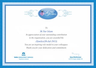 Sk Nur Islam was awarded the (S)miles award for outstanding contribution to his organization. He is recognized as an inspiring role model to his colleagues due to his dedication and commitment to his work. The award was given on July 30, 2013 in appreciation of his contributions.