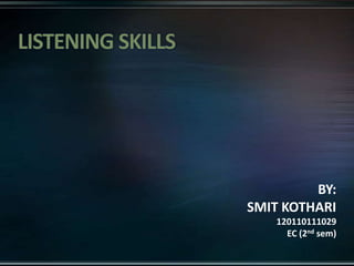 This document discusses effective listening skills. It recommends physically facing the speaker and maintaining eye contact. It also suggests confirming the speaker's intent, details of what they are saying like who, what, where, when, why and how. The document notes barriers to listening like daydreaming or preparing a response. It provides tips for active listening such as increasing your listening span, taking time to listen, listening for meaning beyond the words, giving full attention, listening for ideas, restating the message, and not monopolizing the conversation.