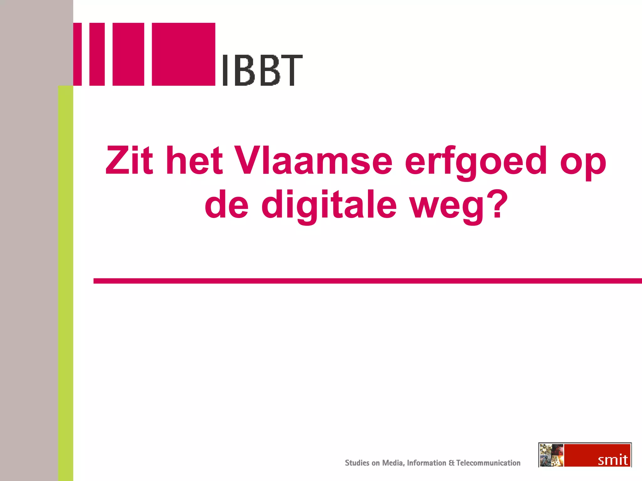 Zit het Vlaamseerfgoed op de digitale weg? Beyl Joke en Nulens Gert IBBT-SMIT/VUB Group of interest 18 juni 2008