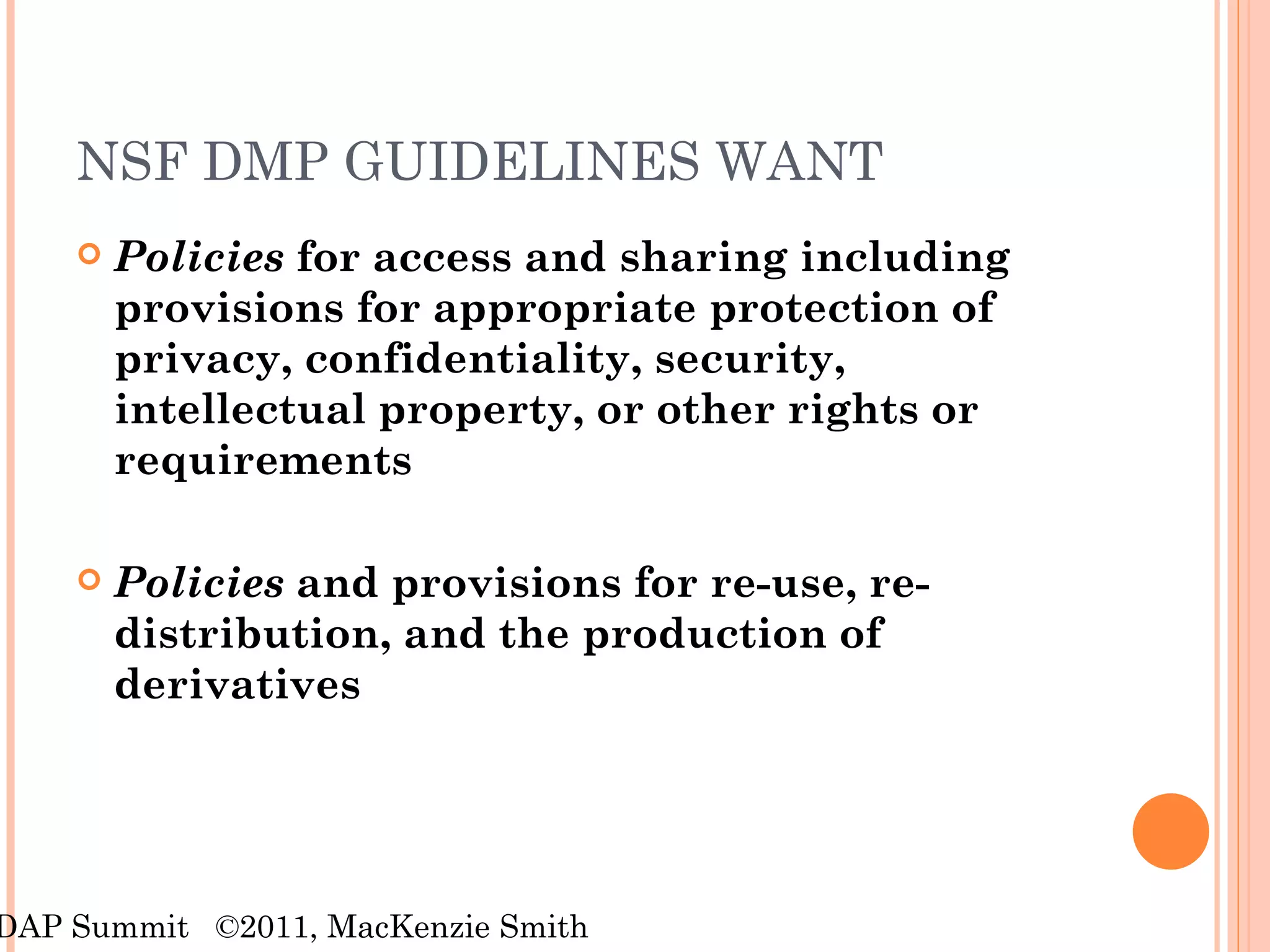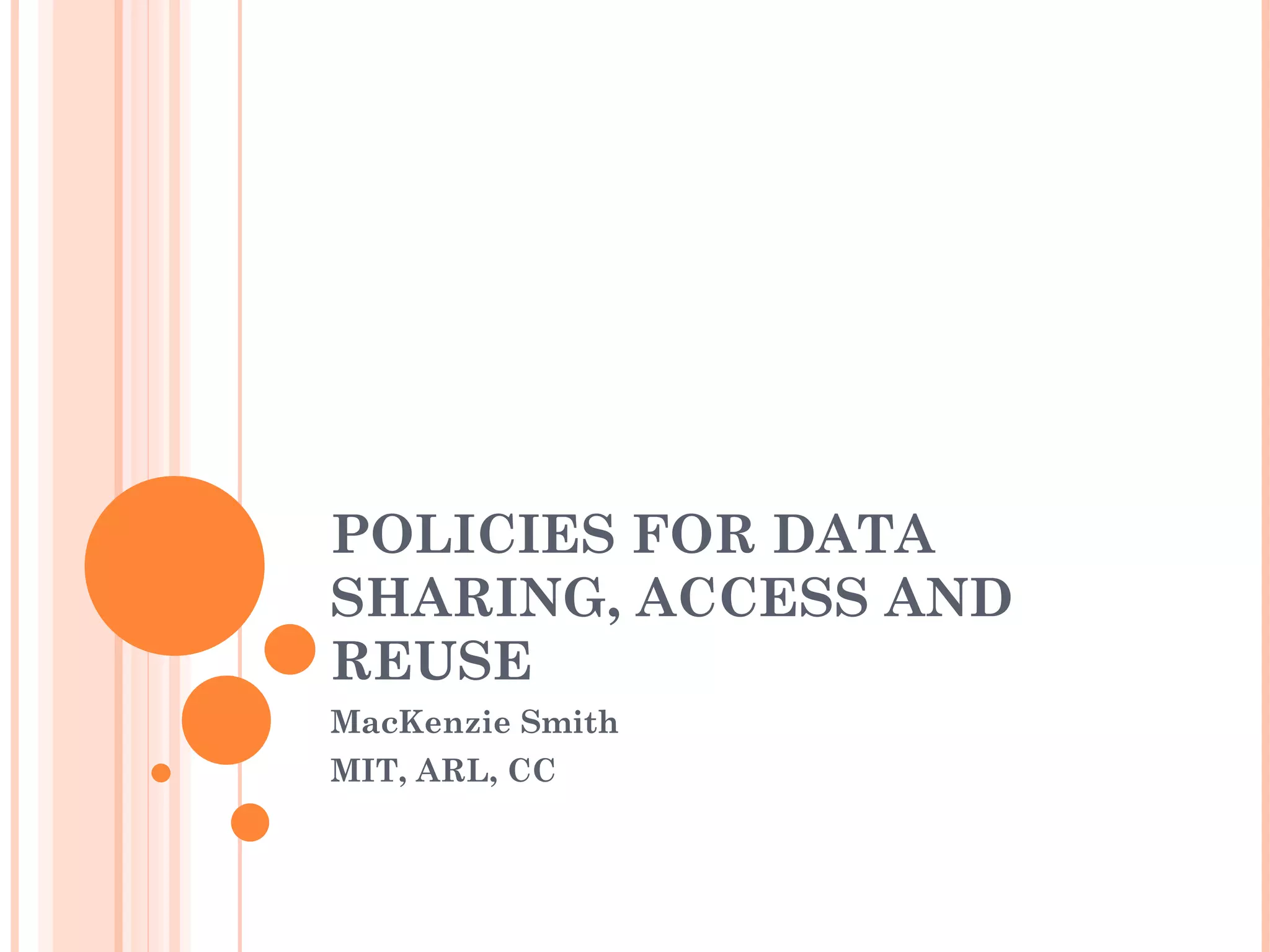 The document discusses policies for data sharing, access, and reuse, emphasizing the need for clear guidelines to protect privacy, security, and intellectual property while fostering interoperability in research. It explores the differences between data use, reuse, and repurposing, and highlights the importance of international collaboration and appropriate licensing for data management. The conclusion suggests that institutional repositories can play a crucial role in standardizing data policies and encouraging compliance with NSF guidelines.