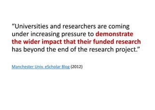 This document discusses open access at Stellenbosch University and provides examples of the impact of open access. It notes that open access increases research visibility, citations, and impact. It describes Stellenbosch University's open access institutional repository SUNScholar and open access journals SUNJournals. It provides examples of downloads and citations of works in SUNScholar and SUNJournals that demonstrate their increasing impact as more individuals globally can access and engage with the research. The document advocates for using metrics like citations, downloads and social media mentions to measure research impact and promote open scholarship.
