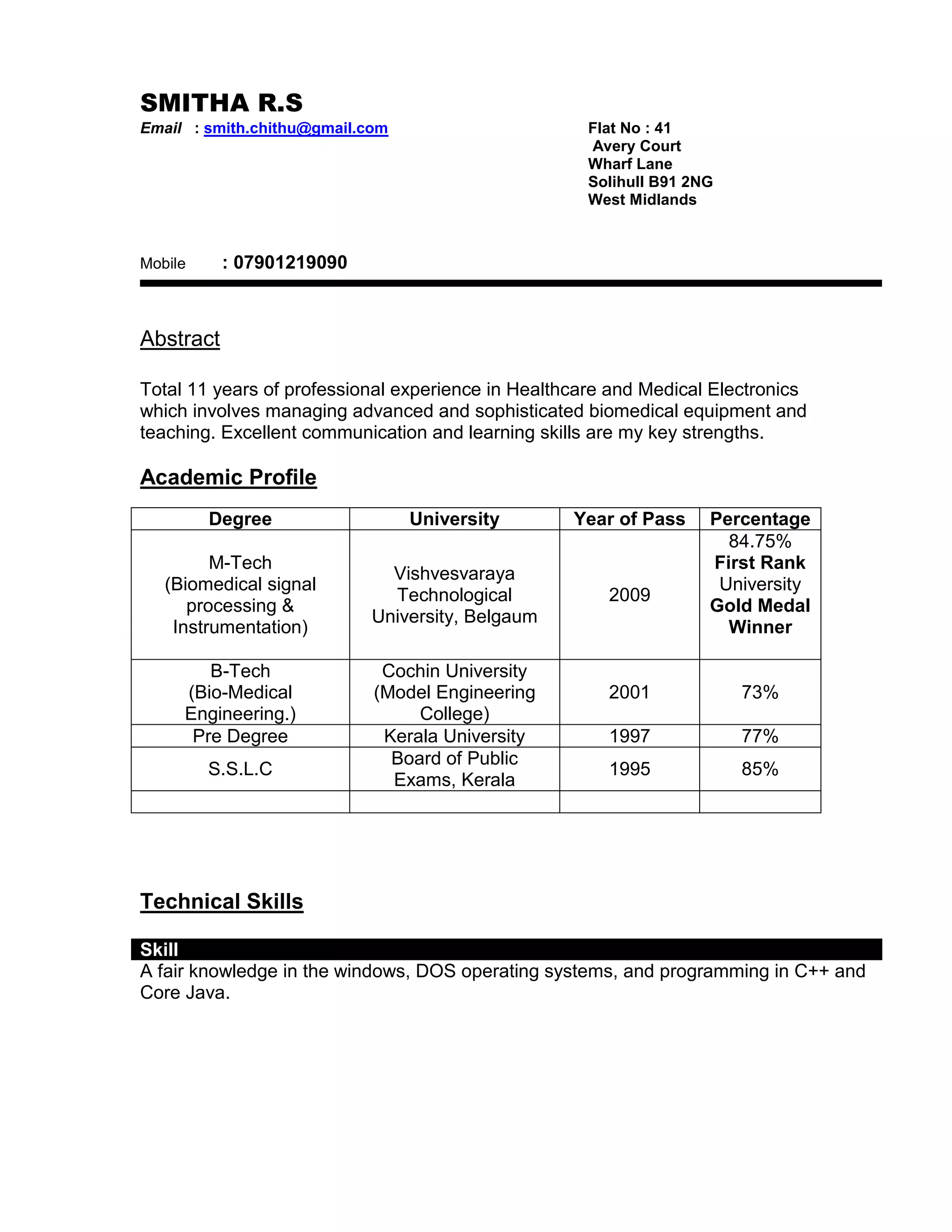 Smitha R.S. has over 11 years of experience in healthcare and medical electronics. She has a M.Tech in Biomedical Signal Processing and Instrumentation from Vishvesvaraya Technological University with 84.75% and B.Tech in Bio-Medical Engineering from Cochin University with 73%. Her technical skills include a fair knowledge of Windows, DOS, C++ and Core Java. She has worked as an Assistant Professor, Lecturer and Biomedical Engineer at various institutions. For her M.Tech she developed an in silico analysis program of nucleotide sequences for Rheumatoid Arthritis. For her B.Tech she developed projects on volume visualization in medical imaging and galvanic skin response monitoring.
