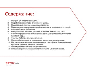 Документ описывает стратегию SMM для привлечения клиентов и увеличения продаж через интернет, охватывая аспекты разработки стратегии, контентного планирования и использования различных социальных медиа. Важное внимание уделяется взаимодействию с целевой аудиторией, оценке эффективности и рекомендациям по проведению рекламных кампаний. Также рассматриваются инструменты и сервисы для эффективного управления SMM-кампаниями.