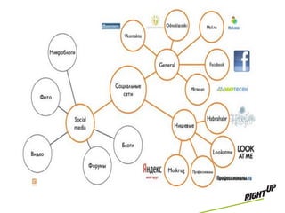 Документ описывает стратегии SMM для малого и среднего бизнеса, включая мониторинг социальных медиа, управление репутацией и создание сообществ. Приведены статистические данные о популярных социальных сетях, их аудитории и возможностях для бизнеса. Также изложены рекомендации по продвижению, анализу результатов и мифы о социальных медиа.