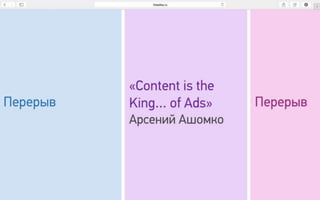 Документ описывает работу медиа компании нового поколения, которая реализует 15 проектов на 10 платформах с аудиторией в 40 миллионов участников. Основное внимание уделяется таким методам, как прямая реклама и product placement, а также развитию сообществ через социальные медиа. Отмечается важность создания контента и его распределения через различные каналы.