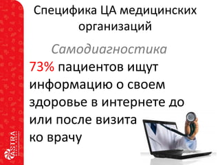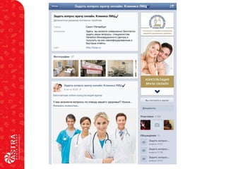Документ обсуждает влияние социальных коммуникаций в интернете на медицинские организации и поведение пациентов, отмечая, что 73% ищут информацию о здоровье онлайн. В нем подчеркивается важность активного присутствия в социальных сетях и ответного взаимодействия с клиентами для привлечения и удержания пациентов. Также рассматриваются этические аспекты, такие как соблюдение конфиденциальности и границ в отношении взаимодействия врачей и пациентов.