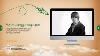 Документ представляет собой информацию о SMM (маркетинге в социальных медиа) и разработке стратегий интернет-продвижения. Обсуждаются темы, такие как контентные стратегии, заработок SMM-специалистов и создание собственных SMM-агентств. Также упоминаются перспективы и востребованность профессии, а также платформа smm2.ru и её контакты.