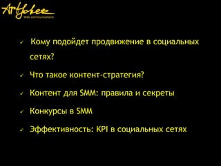 Документ описывает правила и стратегии успешного продвижения бизнеса в социальных сетях (SMM), включая выбор целевой аудитории и создание эффективной контент-стратегии. Освещаются различные типы контента, методы вовлечения пользователей и организации конкурсов, а также ключевые показатели эффективности (KPI) для оценки результатов. Также рассматриваются специфические особенности работы с такими платформами, как Facebook, ВКонтакте и Instagram.