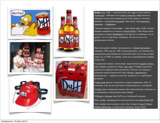 Документ содержит информацию о различных вымышленных продуктах и персонажах из популярных мультфильмов и фильмов, таких как пиво 'Дафф' из 'Симпсонов', конфеты 'Берти Боттс' из 'Гарри Поттера', и авиакомпания 'Oceanic Airlines'. Также обсуждаются свойства различных товаров, таких как горький шоколад и гречневая каша. Все эти элементы иллюстрируют влияние вымышленных брендов на культуру и общество.