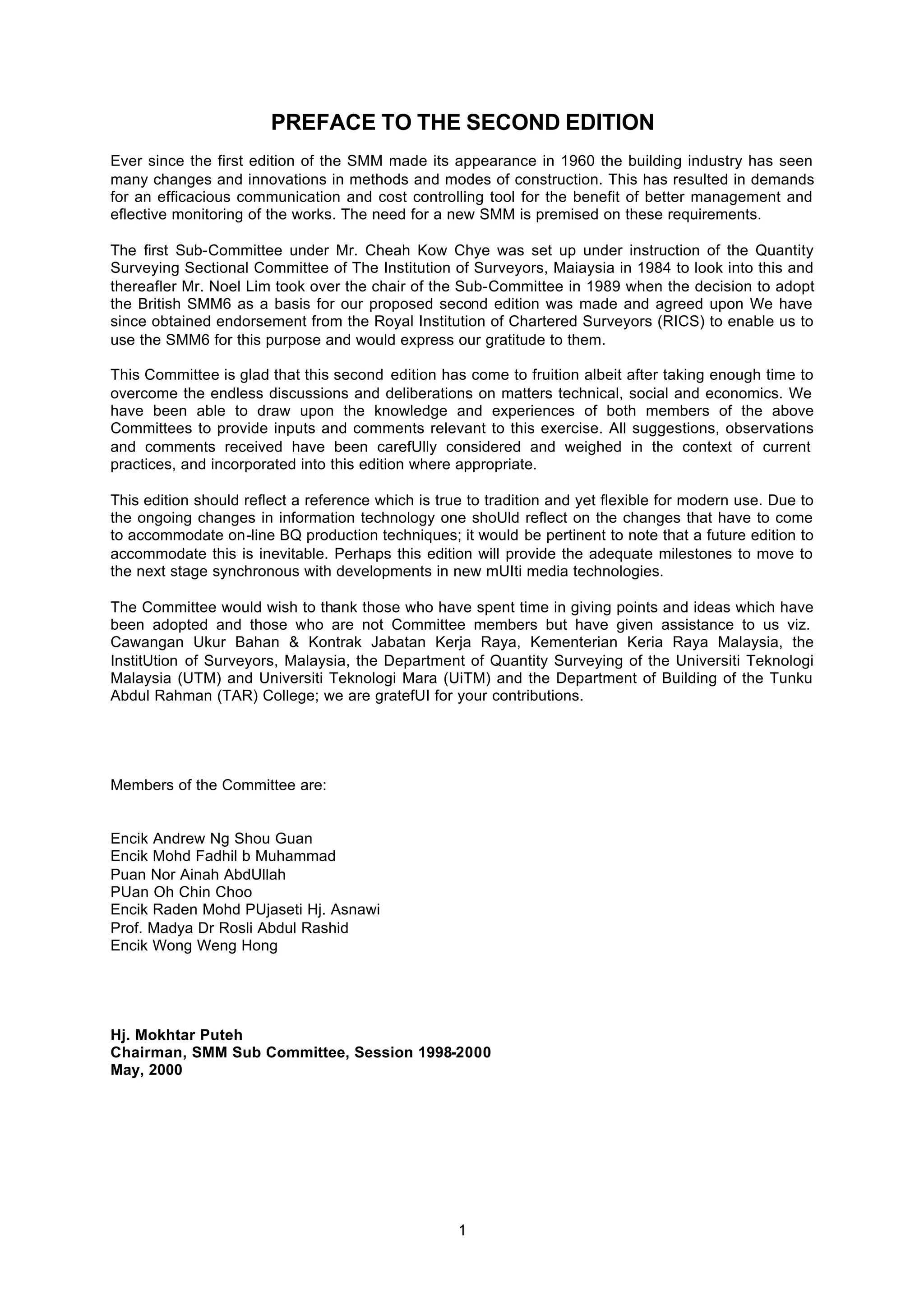 This document provides the preface and contents for the second edition of the Standard Method of Measurement for Building Works in Malaysia. It summarizes the changes in construction methods that prompted the need for an updated reference document. It describes the process undertaken by the committee to adopt the British SMM6 as a basis and incorporate local practices and materials. The document outlines the goals for this edition to reflect tradition while allowing flexibility for modern use and future technological changes.