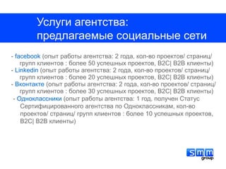 Агентство SMMGroup предлагает услуги по продвижению в социальных сетях, включая Facebook, LinkedIn, ВКонтакте и Одноклассники, с более чем 50 успешными проектами. Его руководители, Дмитрий Ткаченко и Вита Кравчук, имеют значительный опыт в B2B-маркетинге и являются профессиональными тренерами в области социальных медиа. Агентство предоставляет услуги по разработке стратегий, ведению страниц и контекстной рекламе для клиентов из различных областей.
