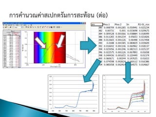 การใช้เครื่องมือวัดสเปกตรัมหรือเรียกว่าสเปกโตรมิเตอร์ ค่าที่วัดออกมาได้จะอยู่ในรูป ของค่าความเข้มแสง ดังนั้นต้องนามาคานวณเพื่อแปลงให้อยู่ในรูปของค่าสเปกตรัมการ สะท้อน (Reflectance) เมื่อ Iout คือ ความเข้มแสงของรังสีที่สะท้อนออกมาจากวัสดุที่สนใจ Iin คือ ความเข้มแสงของรังสีที่ตกกระทบวัสดุทสนใจ ี่ R คือ การสะท้อนของแสง (Reflectance)