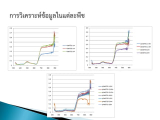 จากการคานวณจะได้ย่านความยาวคลื่นในการวิเคราะห์ดังนี้ 450, 472, 490, 536, 590, 620, 750 และ 896nm จากข้อมูลช่วงค่าลายเส้นของพืชและย่านที่ใช้ในการ วิเคราะห์ จะทาให้สามารถทราบถึงความแตกต่างของสเปกตรัมของพืชทั้ง 5 ชนิด