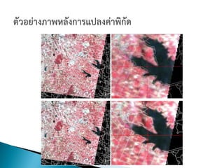 เป็ น ฟั ง ก์ ชั น ในการเปลี่ ย นรู ป เชิ ง เส้ น เพื่ อ ใช้ ใ นการประมาณค่ า ขนาดที่ แ ท้ จ ริ ง ของ ข้อมูลภาพ ทาการแยกสัญญาณรบกวนออกจากข้อมูล และช่วยลดเวลาในการคานวณ สาหรับในส่วนของการประมวลผล ค่า eigenvalues และภาพ MNF จะถูก ใช้ในการประเมินขนาดของข้อมูล โดย ค่า eigenvalues ในแต่ละแถบความถี่ จะประกอบด้ ว ยข้ อ มู ล ต่ า ง ๆ โดย เรียงลาดับตามขนาดของข้อมูล ภาพที่ได้ จะมีข้อมูลที่สอดคล้องกับความเชื่อมโยง เชิงพื้นที่ ในขณะที่ภาพสัญญาณรบกวน จะไม่มีข้อมูลในเชิงพื้นที่เลย