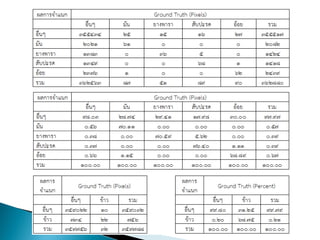 จากผลที่ ไ ด้ จ ะเห็ น ได้ ว่ า ค่ า ความถู ก ต้ อ งในการประเมิ น พื้ น ที่ เ พาะปลู ก ข้ า วเท่ า กั บ 64.79% และพื้นที่ที่ไม่ใช่ข้าวเท่ากับ 94.66% ถ้ารวมความถูกต้องของพื้นที่ทั้งหมด จะเท่ากับ 88.2626% ซึ่งค่อนข้างมีความถูกต้องสูง ดังนั้นจากการทดสอบดังที่กล่าว มานี้ทาให้สามารถสรุปได้ว่าสามารถนาข้อมูลสเปกตรัมไลบรารี่มาใช้ในการประเมิน พื้นที่เพาะปลูกได้ ต่อมาจึงนาข้อมูลนี้มาสร้างให้เป็นรูปแบบมาตรฐาน