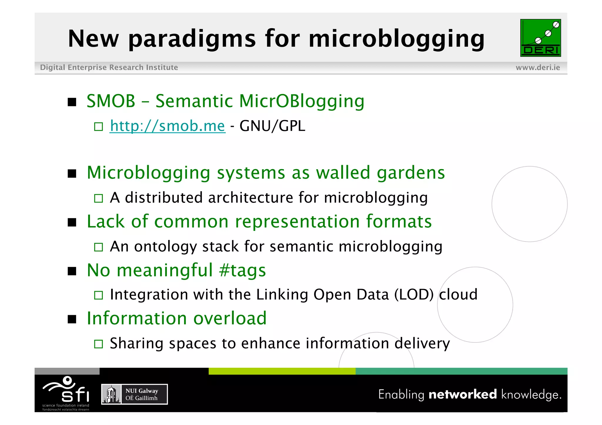 The document introduces SMOB, a framework for semantic microblogging. SMOB addresses issues with current microblogging systems by using a distributed architecture, common representation formats through an ontology stack, meaningful tags through integration with Linked Open Data, and customized information delivery through sharing spaces. It reuses popular models like FOAF and SIOC and models posts in RDFa. SMOB also describes ongoing work on sparqlPuSH for real-time synchronization and Twarql for LOD interlinking from Twitter data.