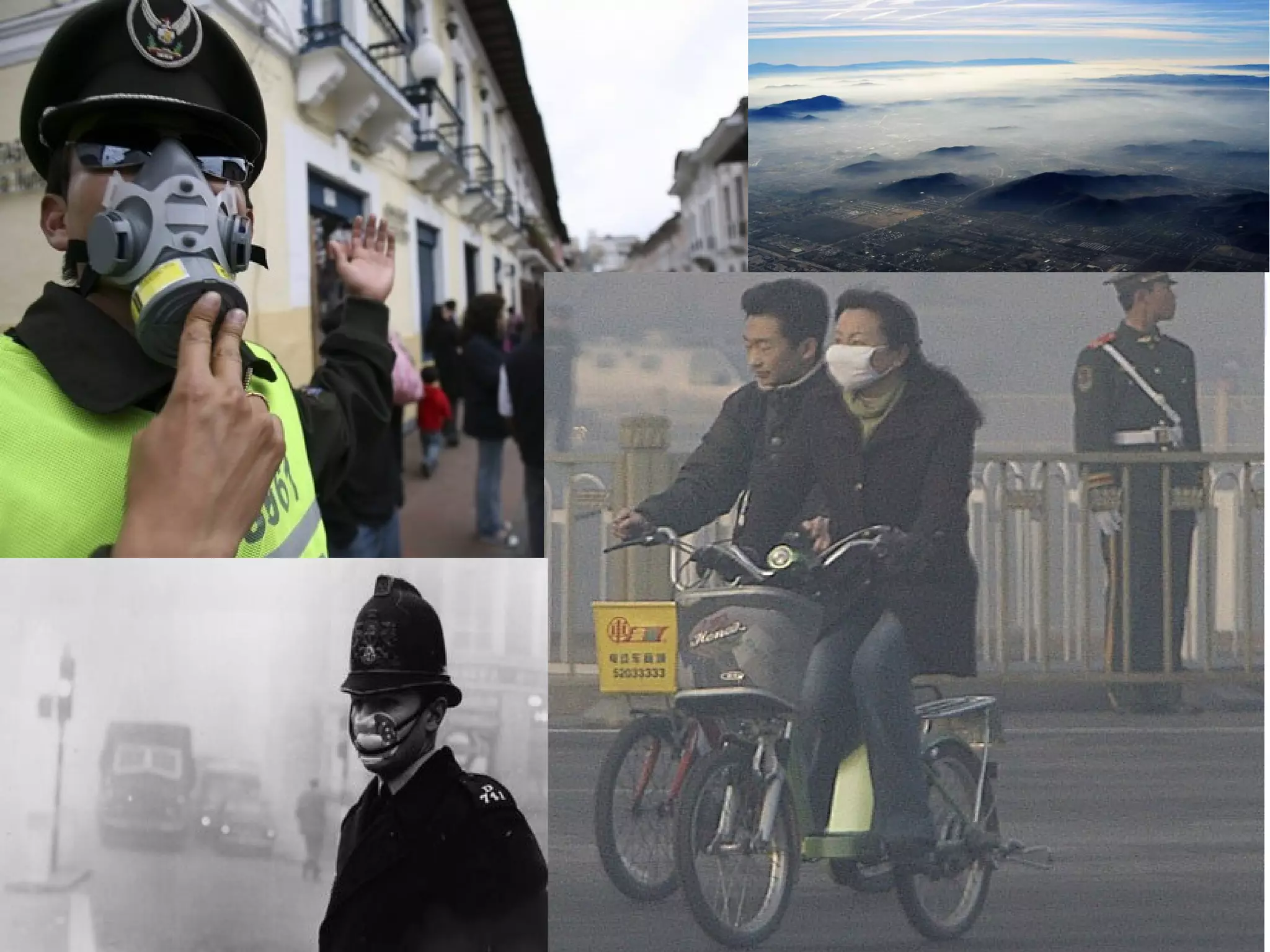 This document discusses cities that experience smog problems such as London, Mexico City, Tehran, LA, and Beijing. It then lists potential solutions to reduce smog like using catalytic converters, vapor recovery systems, renewable energy sources, and limiting access of polluting vehicles in cities.