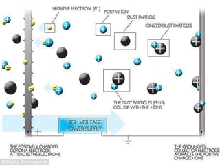 The document summarizes a smog-free tower installed in the Netherlands that uses ion technology to clean air. It sucks in dirty air and releases cleaner air through vents. It is able to clean 30,000 cubic meters of air per hour. The tower works by charging air with positive ions that attach to fine dust particles, which are then drawn into and collected inside the tower by a negatively charged surface. The designer hopes to install additional smog-free towers in highly polluted cities like Delhi to help improve air quality.