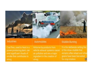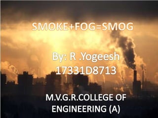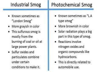 Smog is a combination of smoke and fog formed when pollutants from sources like automobiles, factories, and the burning of coal react with sunlight and moisture in the air. There are two main types of smog: