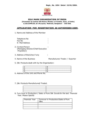 This document is an application for membership or registration as an authorized user of the Silk Mark Organisation of India. It requests membership as a corporate, special, or weaver member and encloses the prescribed application fee. It provides details about the applicant's firm such as name, address, authorized signatory, nature of business as a manufacturer, trader, or exporter, organizational structure, silk products dealt with, and turnover in silk products over the last three years. The applicant declares that the provided particulars are true and agrees to abide by the rules and regulations of the Silk Mark Scheme.